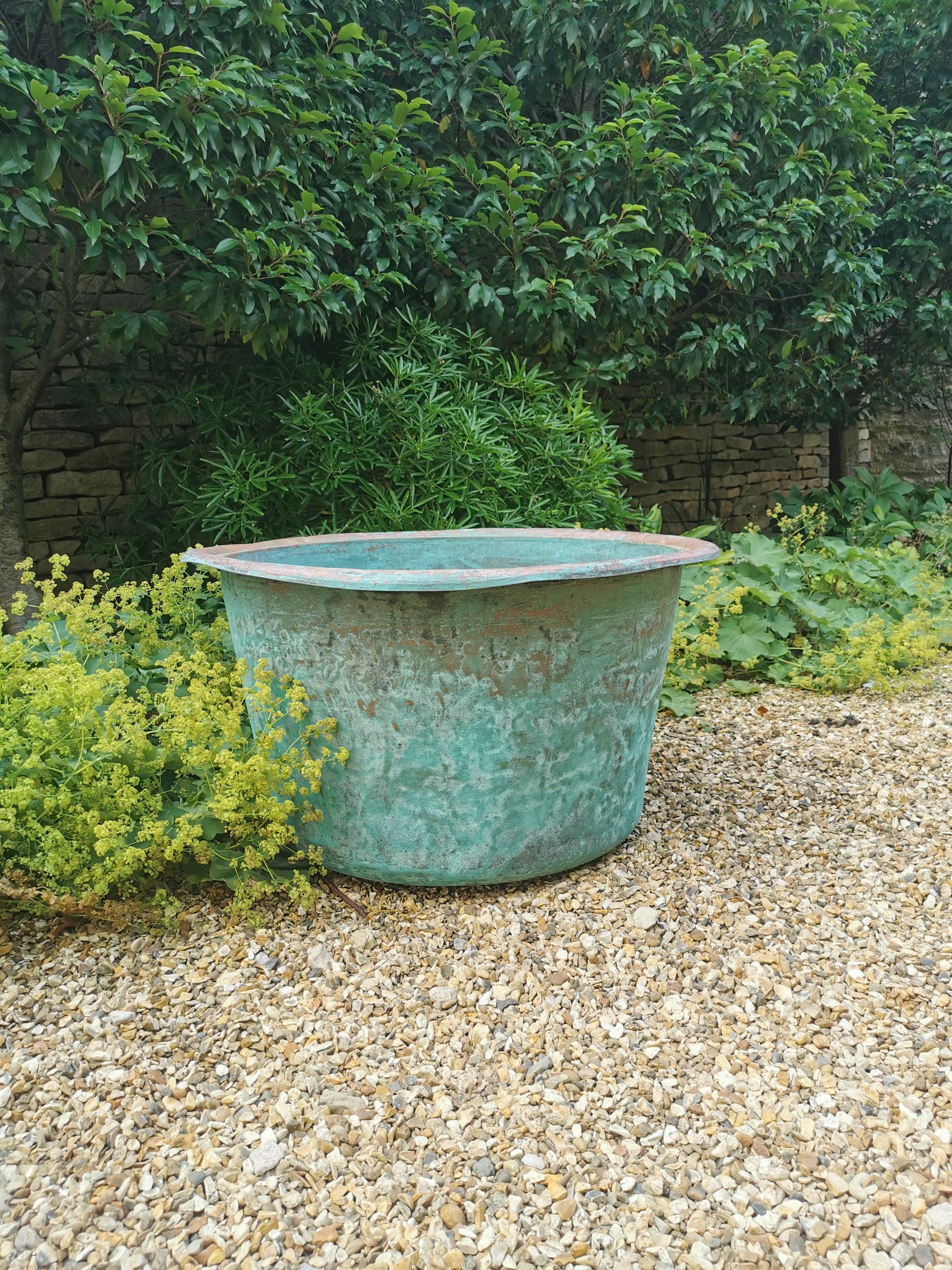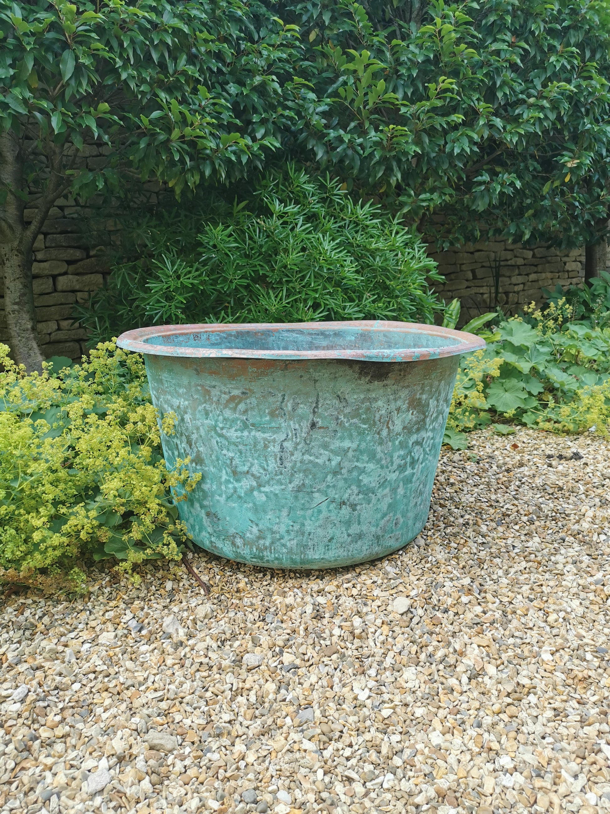 A vintage copper with a lovely verdigris patina. Ideal as a planter for bulbs, shrubs or small trees. Holds water but drainage holes can be drilled in the base if required.